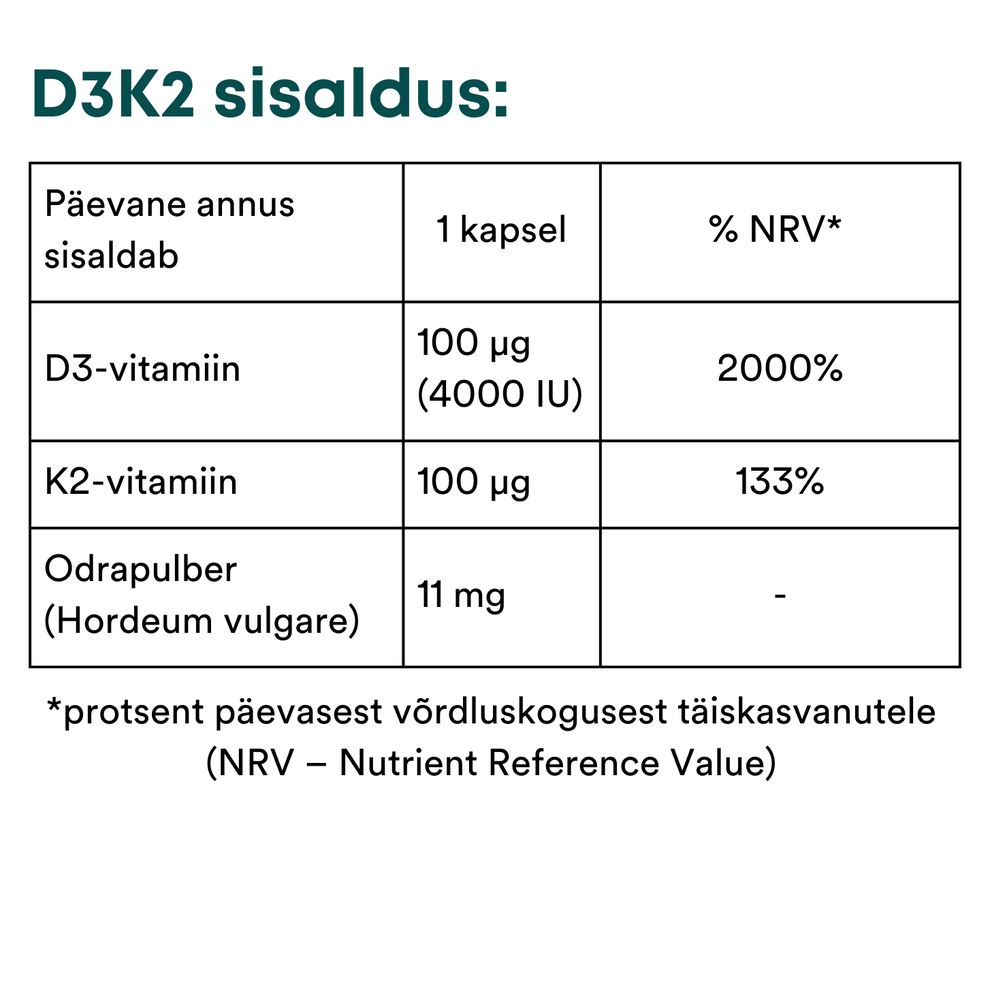 100μg K2-vitamiini suunab aktiivselt kaltsiumit luudesse ja hammastesse.