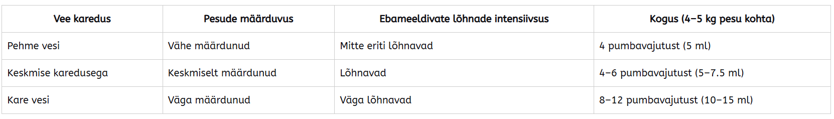 - Doseerimisel hinnata vee karedust, tekstiili mustusastet ja ebameeldivate lõhnade intensiivsust