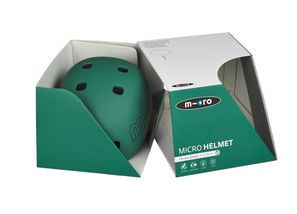 Micro Forest Green kiivril on innovatiivne magnetkinnitus, mida on võrreldes tavapärase kiirkinnitusklambriga lapsel oluliselt lihtsam ja kiirem iseseisvalt kinni panna ja lahti võtta. Kiiver on valmistatud kergest maksimaalset kaitset pakkuvast EPS vahust, mida ümbritseb In-Mould tugev polükarbonaadist väline kaitsev kiht. Kiivri suurust saab reguleerida tagaosas asuvast punasest nupust keerates. Punasele nupule vajutades läheb põlema sinna integreeritud LED tuli.