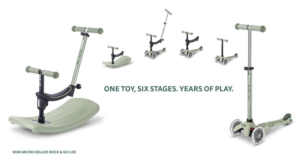 Tegemist on maailma esimese kiikuva tõukerattaga, st selles uuenduslikus tootes on ühendatud kiikumise ja tõukerattaga sõitmise funktsionaalsused. See multifunktsionaalne 6in1 ergonoomiline kaaslane kasvab koos lapsega, olles pisemate jaoks lõbus kiikumisseade, hiljem istme, jalatugede ja lükkevardaga vanemate poolt juhitav sõiduk, seejärel ilma lükkevardata jooksuratas ja lõpuks saab kõik lisad eemaldada ning tõukeratas muutub Micro Mini Deluxe LED ratastega säravaks versiooniks.