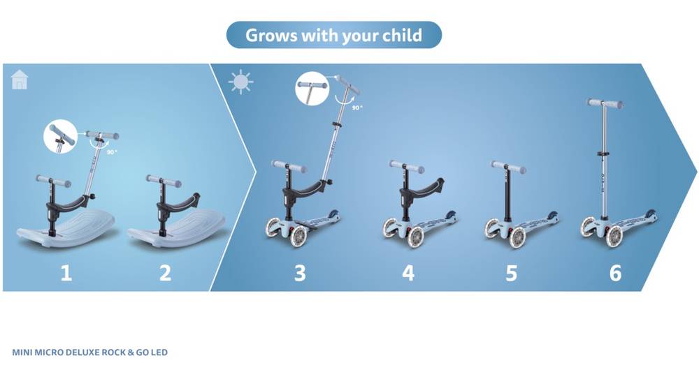 Micro Mini Deluxe Rock & Go LED tõukeratta saab ilma tööriistu kasutamata muuta kergelt kuueks erinevaks versiooniks. Pere pisemad saavad seda kasutada sisekiiguna ja veidi suuremad lapsed täisfunktsionaalse tõukerattana. Ja seda ühel ning samal ajal, st Rock & Go saab olla korraga kasutuses kahe lapse poolt! Nutikas lahendus peredele, kus kasvab korraga vähemalt kaks kuni kuueaastast last!
