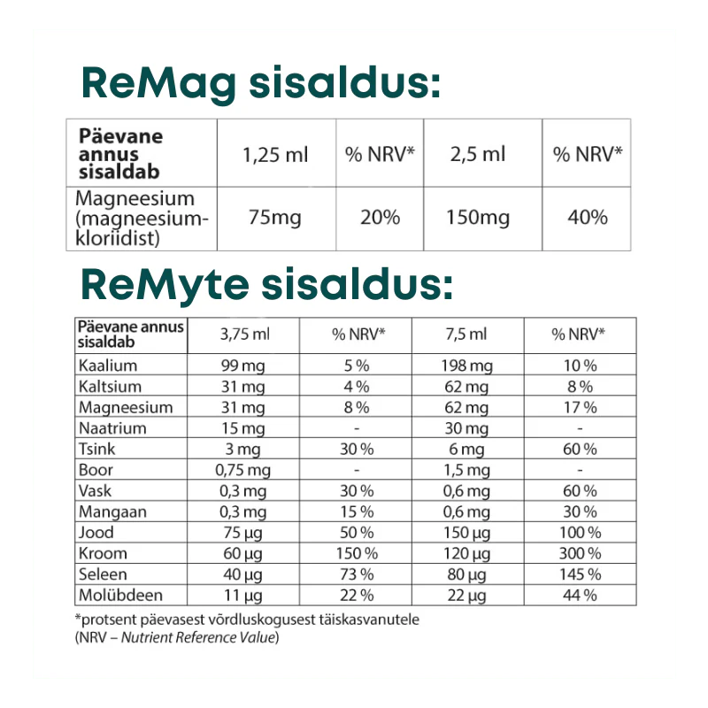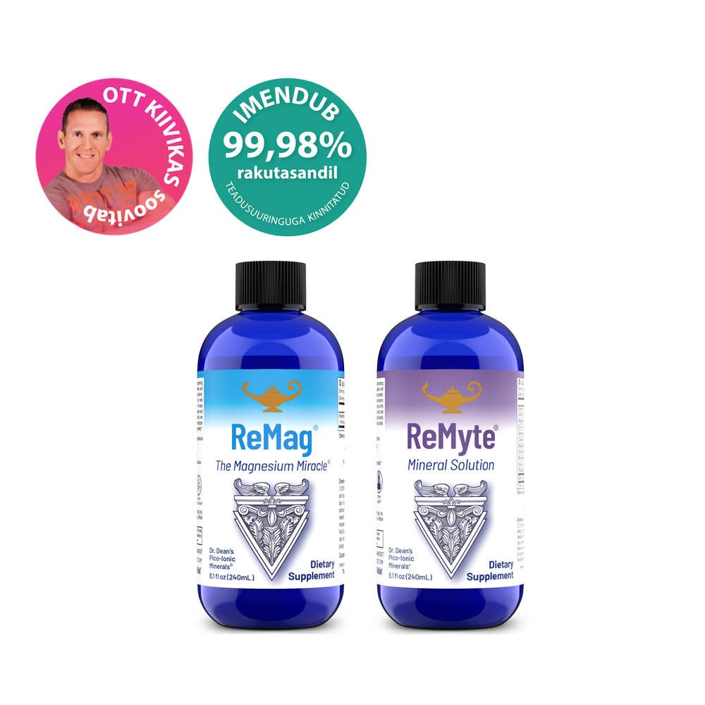 ReMag® vedel magneesium (240ml) ja ReMyte® mineraalainete kompleks (240ml) – mineraalainete komplekt, mis toetab enesetunnet, energiavahetust ja organite tööd.