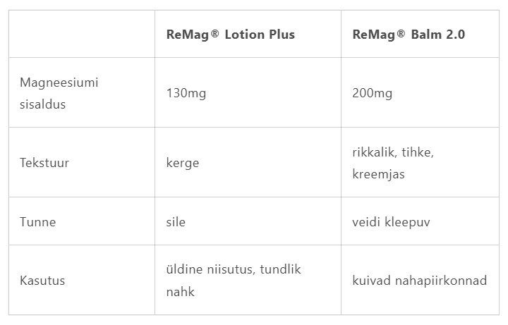 ReMag® Lotion Plus sisaldab kontsentreeritud magneesiumi koos pehmendavate ja toitvate taimeõlidega. Sobib igapäevaseks kasutamiseks.