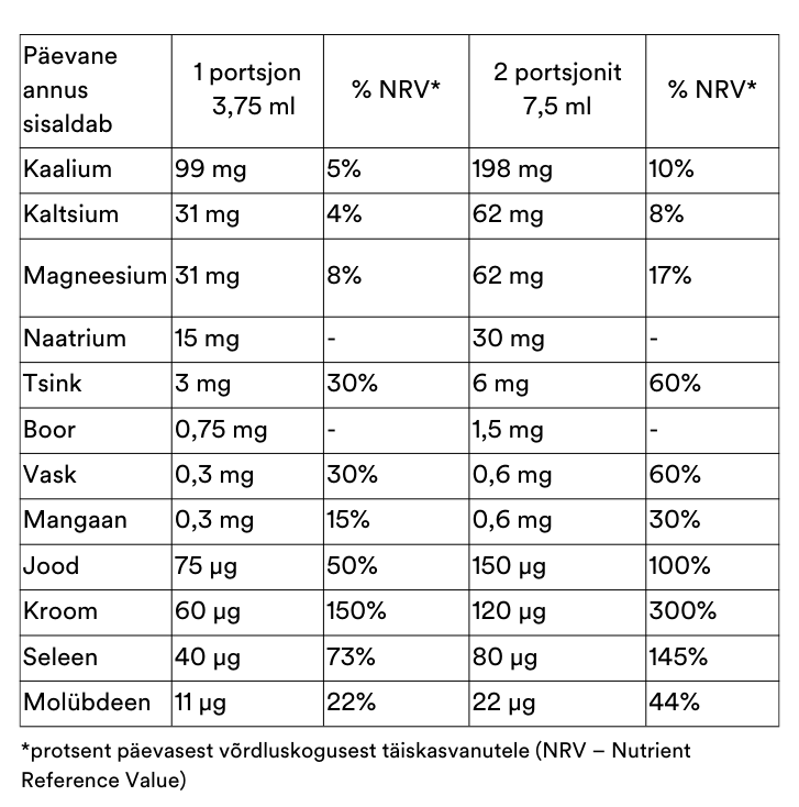 Toidulisand 12 erineva stabiliseeritud piko-ioonilise mineraalainega, vedel kontsentraat. Täielik imendumine rakutasandil (99,98%).