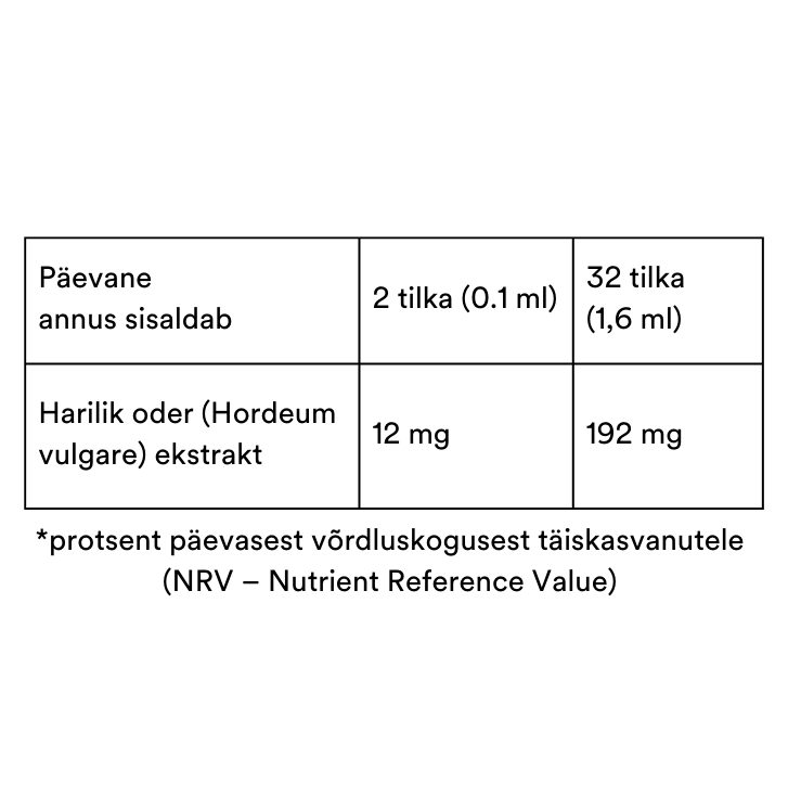 Alusta kogusega 2 tilka päevas (1+1 ehk 0,1ml) ja suurenda igal järgneval nädalal 2 tilga võrra päevas (2+2, 3+3 jne) kuni 16+16=32 tilgani (1,6ml) päevas.